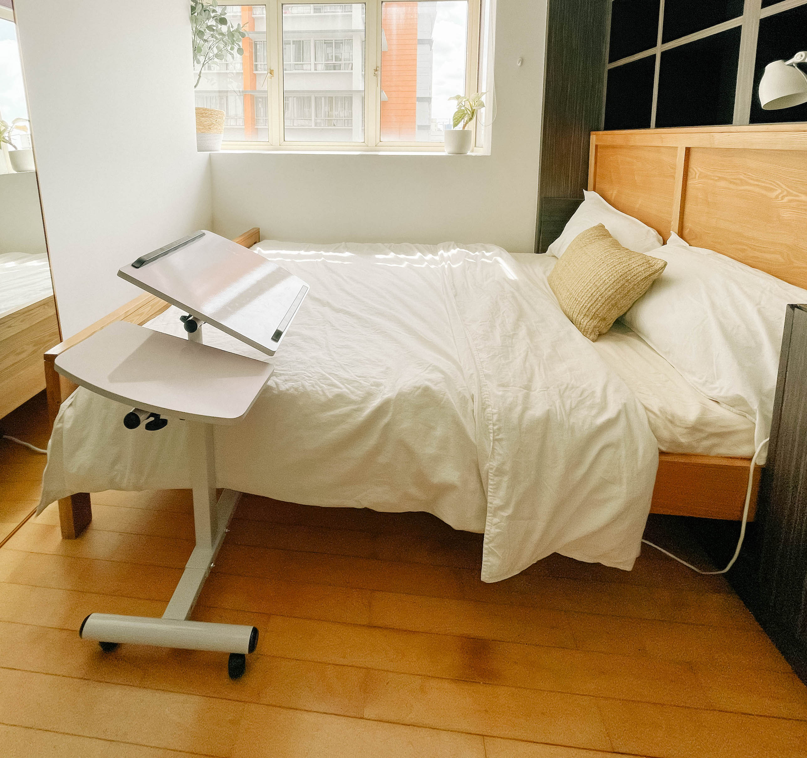 Wake up in this bright apartment featuring big windows and lots of wooden fixtures.